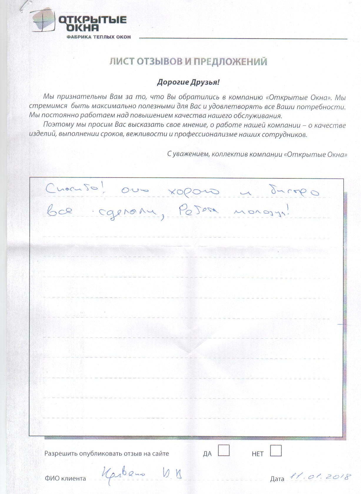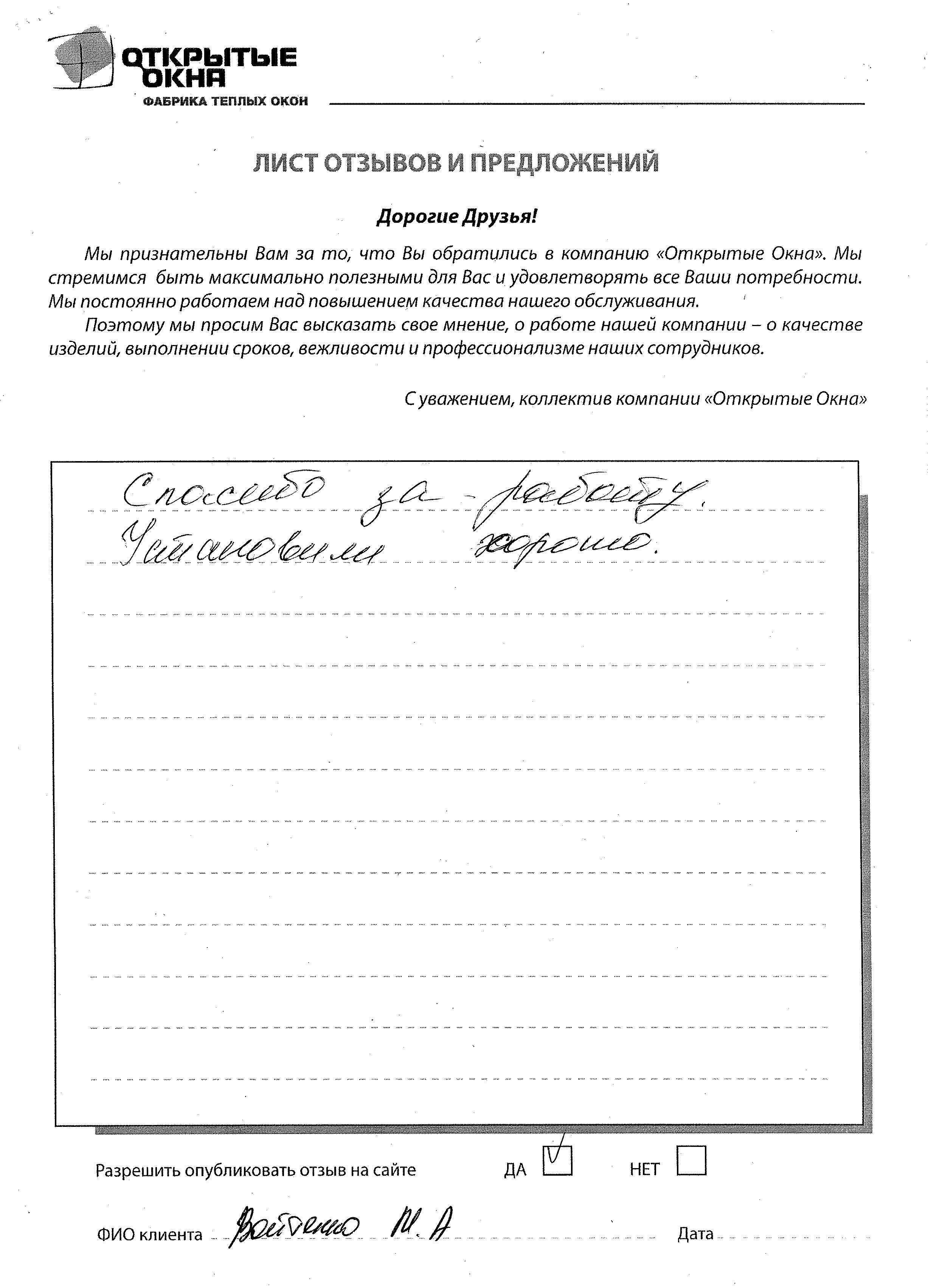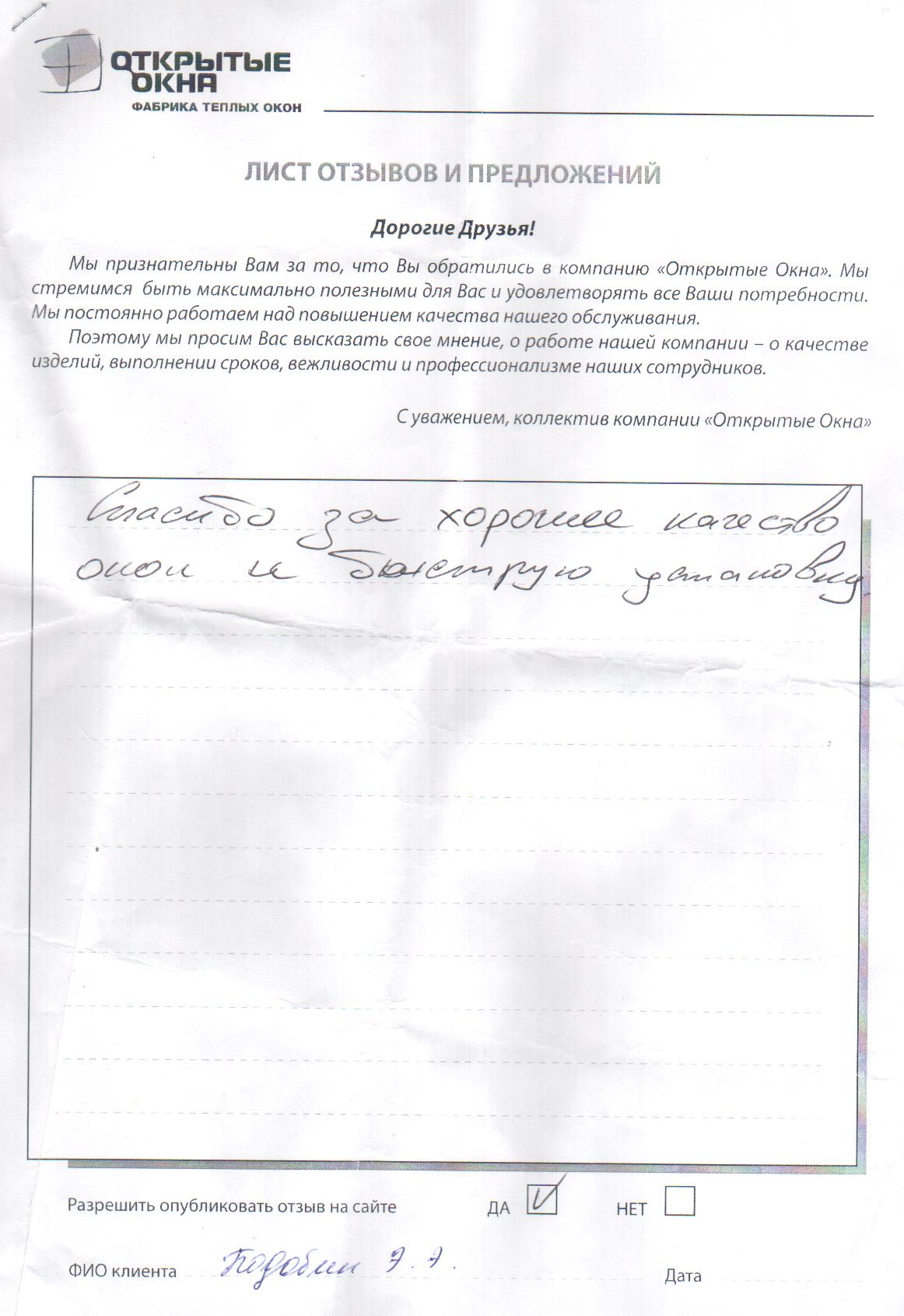 Спасибо за хорошее качество окон