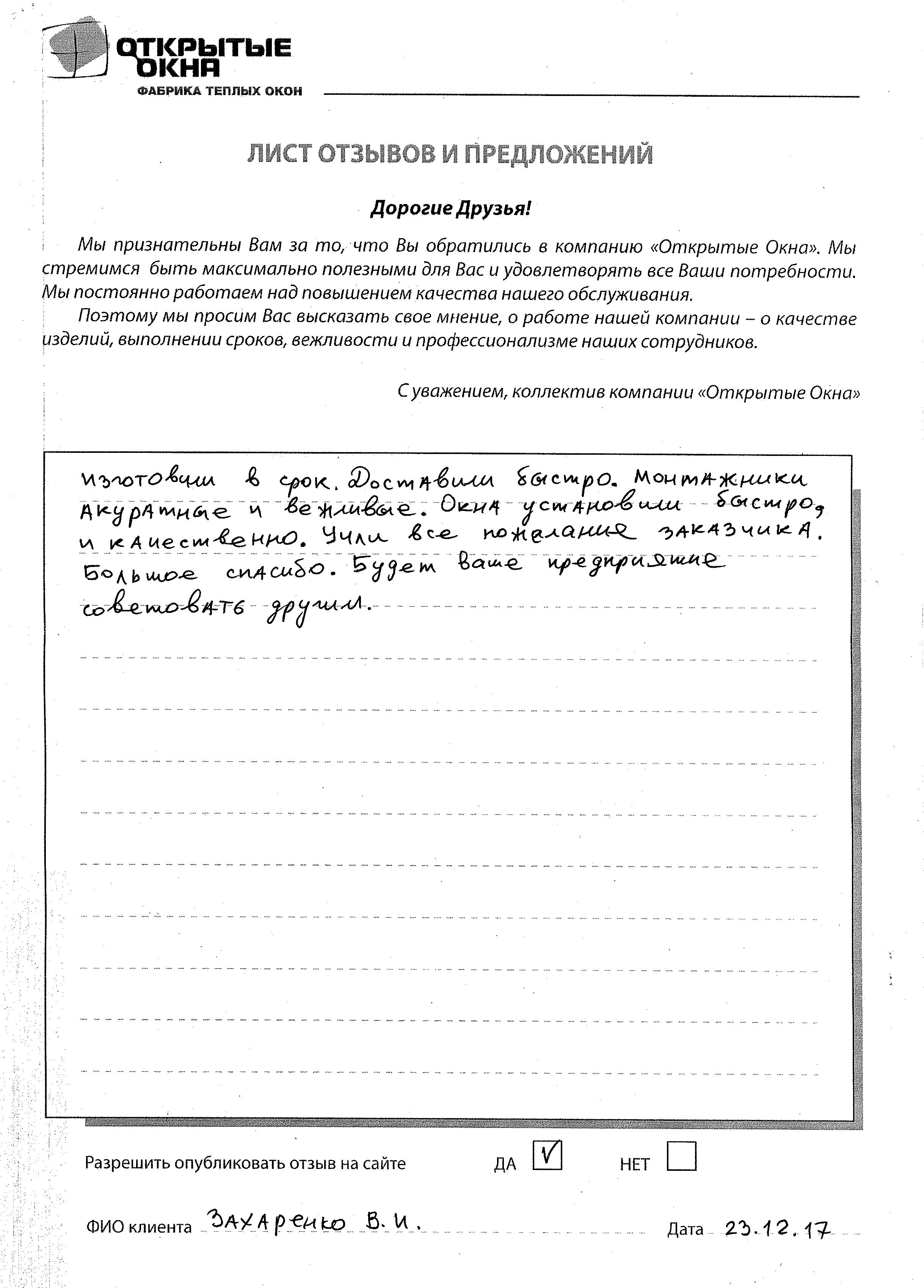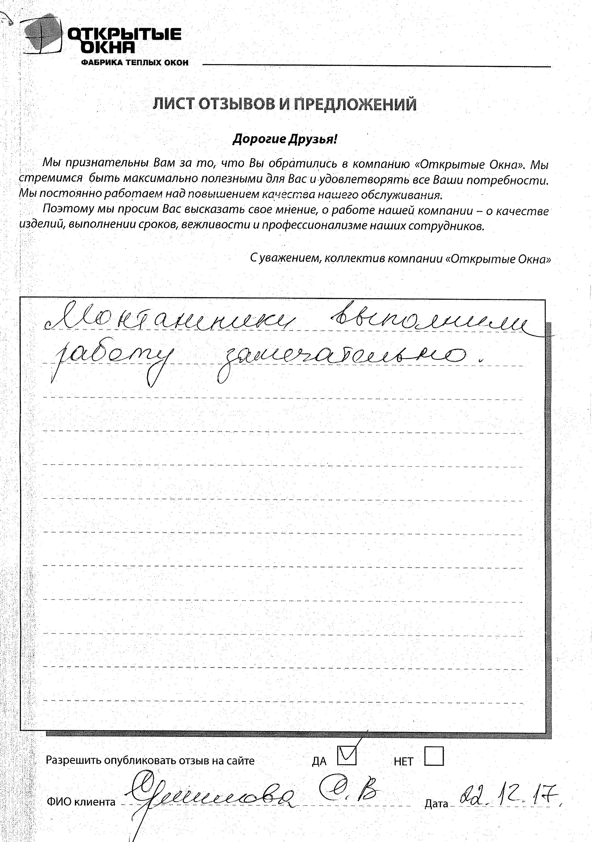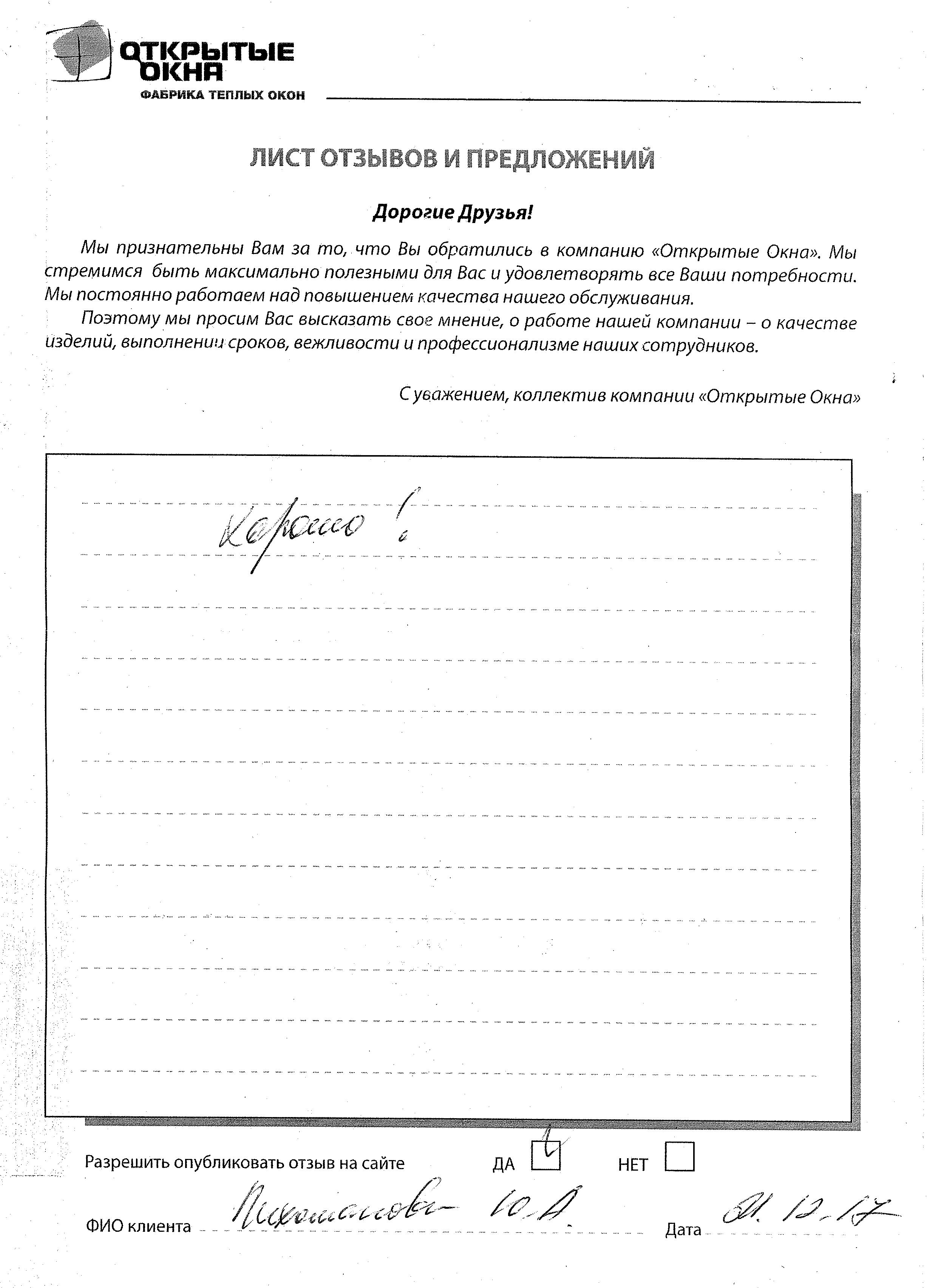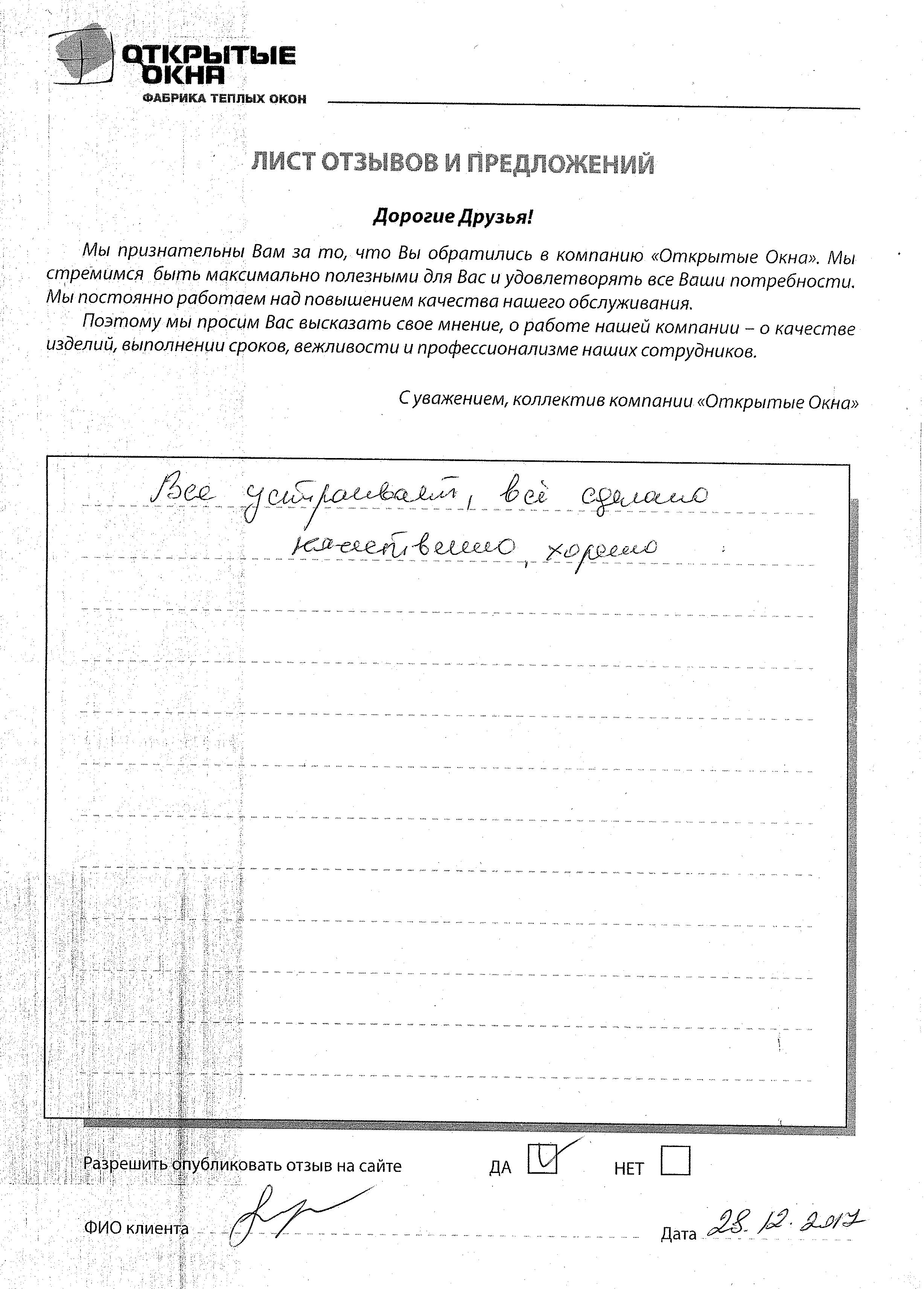 Изготовили в срок. Доставили быстро. Монтажники аккуратные и вежливые. Окна установили быстро и качественно. Учли все пожелания заказчика. Большое спасибо. Будем ваше предприятие советовать другим.