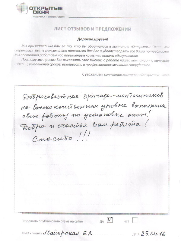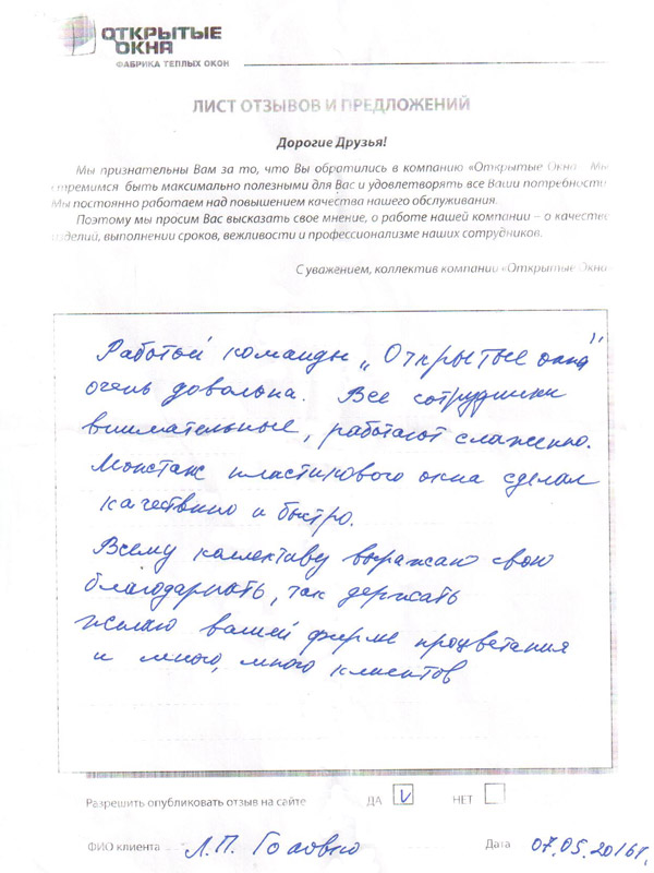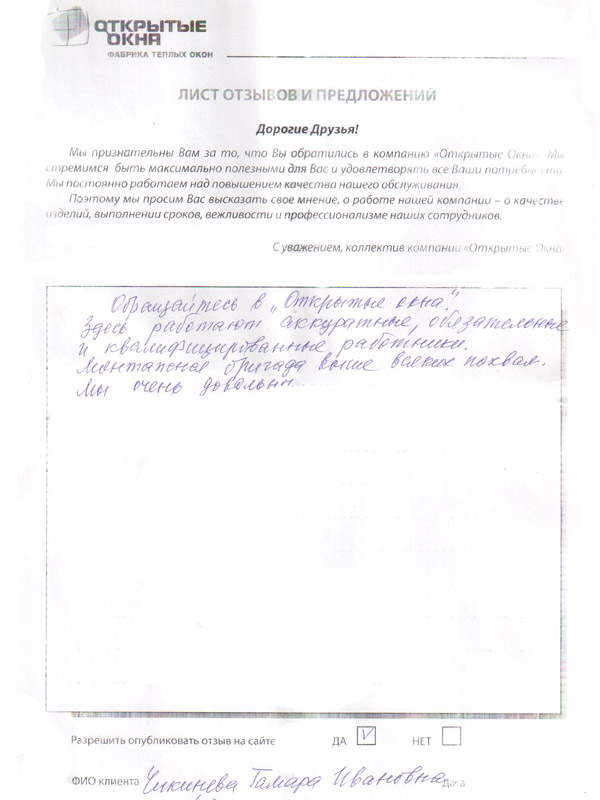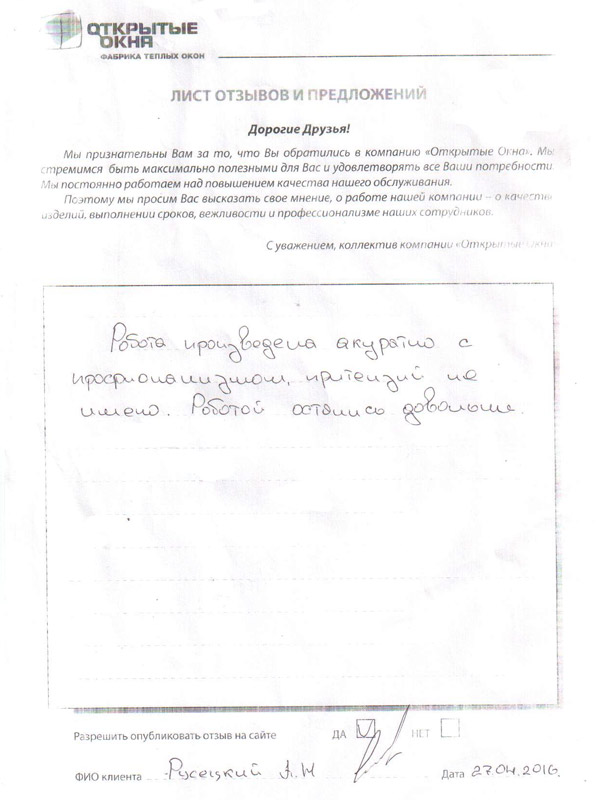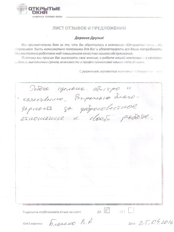 Работой команды «Открытые окна» доволен. Работают слажено, грамотно, без лишних проволочек. Монтаж пластиковых окон произведен быстро и качественно. Дан совет по эксплуатации установленного окна Rehau. Выражаю свою благодарность и признательность профессионализму вашей команды, а особенно монтажникам Сергею и Анатолию.