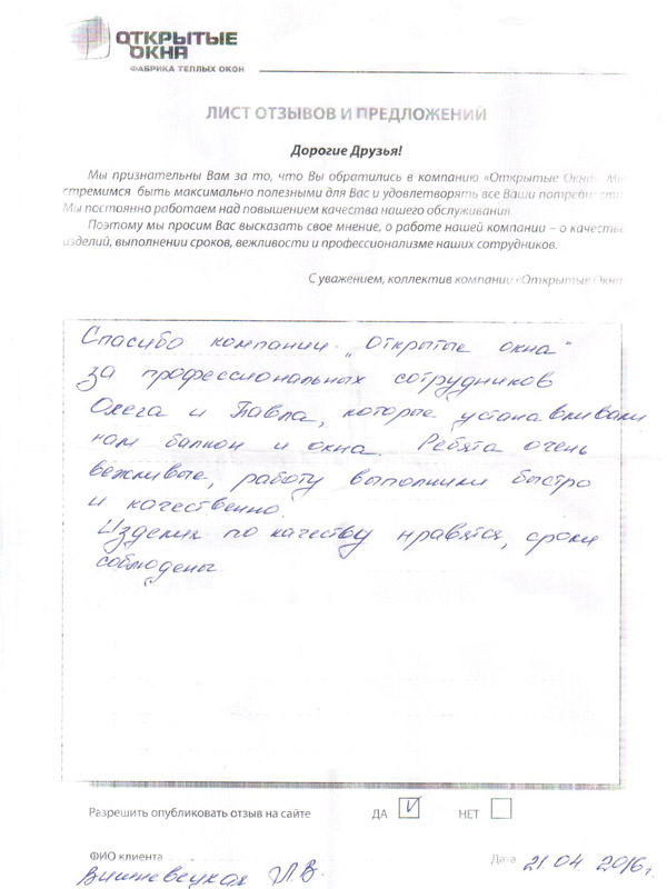 Большое человеческое спасибо за добросовестную работу монтажнику пластиковых окон - Сергею, а также администратору Юле.