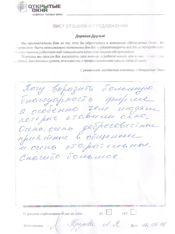 Хочу выразить большую благодарность фирме Открытые окна, а особенно тем людям, которые ставили пластиковые окна Rehau.