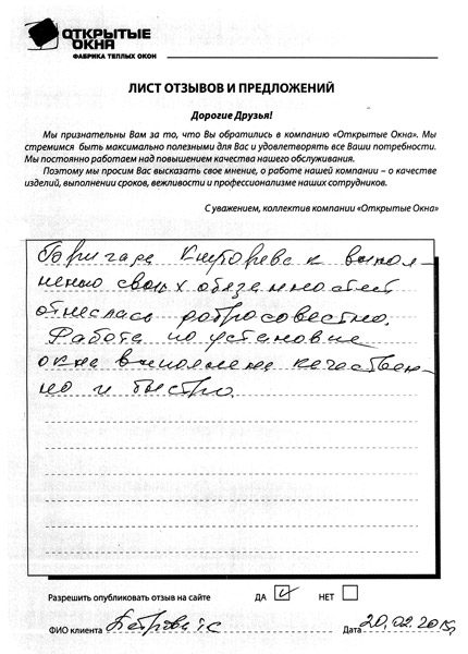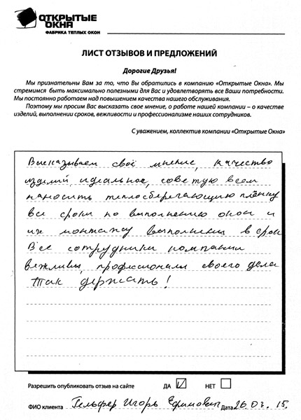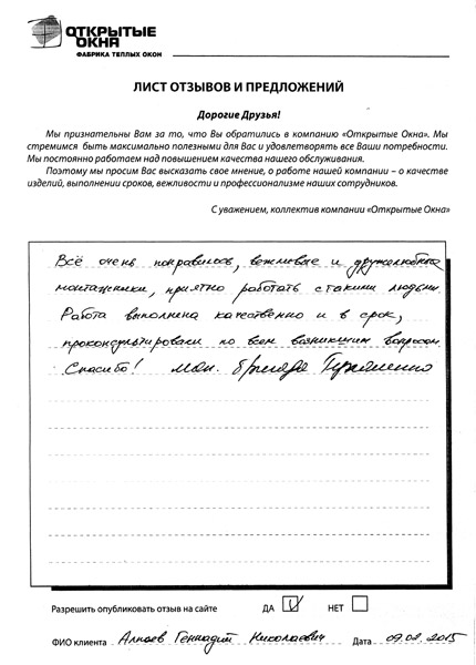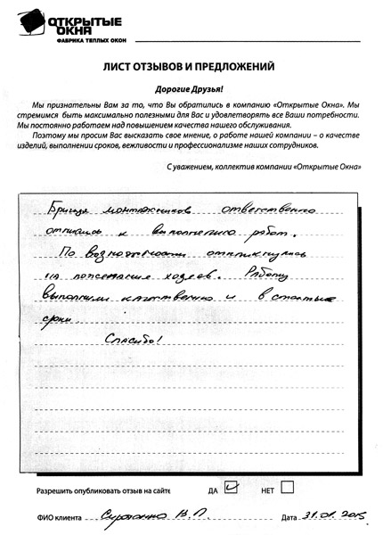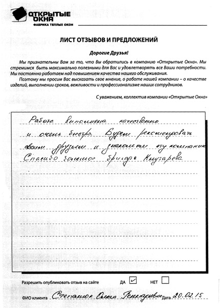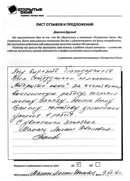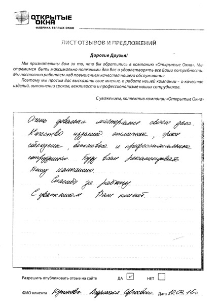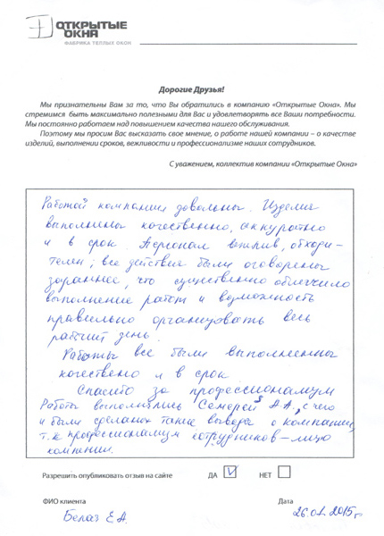 Хочу выразить благодарность всем сотрудника компании «Открытые окна» за качественно выполненную работу, согласно моему заказу.